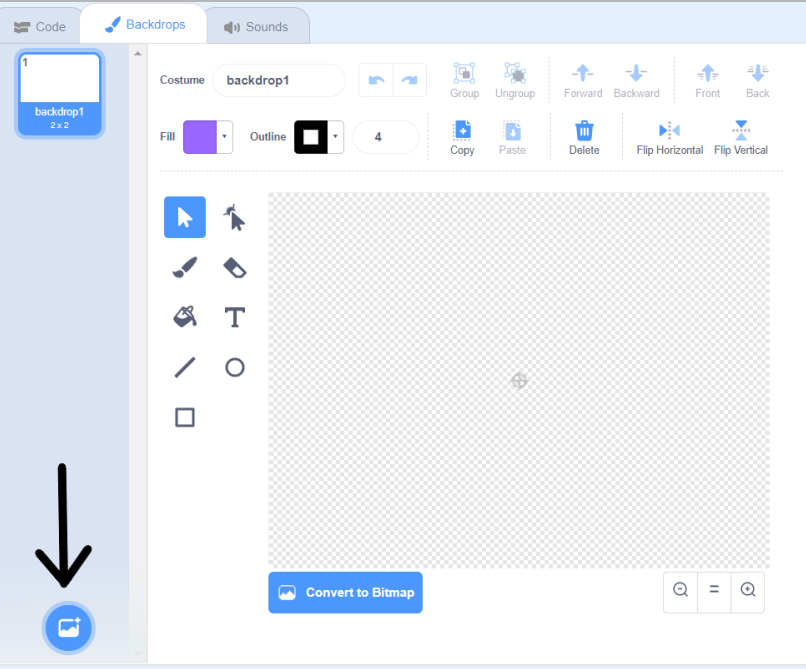 First, find this backdrops tab in a new Scratch project. Your screen should look something like this: